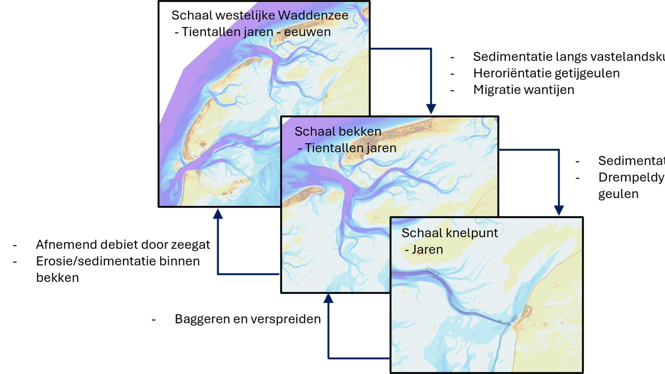 Een van de meest waardevolle toevoegingen in de rapportage is het conceptuele model. Dit model brengt verschillende schaalniveaus en processen binnen het Vlie in beeld en helpt bij het verklaren van de waargenomen trends. Het laat zien hoe grootschalige processen zoals zeespiegelstijging en veranderende getijdendynamiek, doorwerken op kleinere elementen zoals geulen en platen. Daarnaast biedt het model inzicht in terugkoppelingsmechanismen tussen stroming, sedimentatie en ecologische ontwikkelingen. Het model geeft hierdoor een eenvoudig inzicht in hoe het systeem werkt. Dit maakt het een sterk hulpmiddel voor beleidsmakers en beheerders.